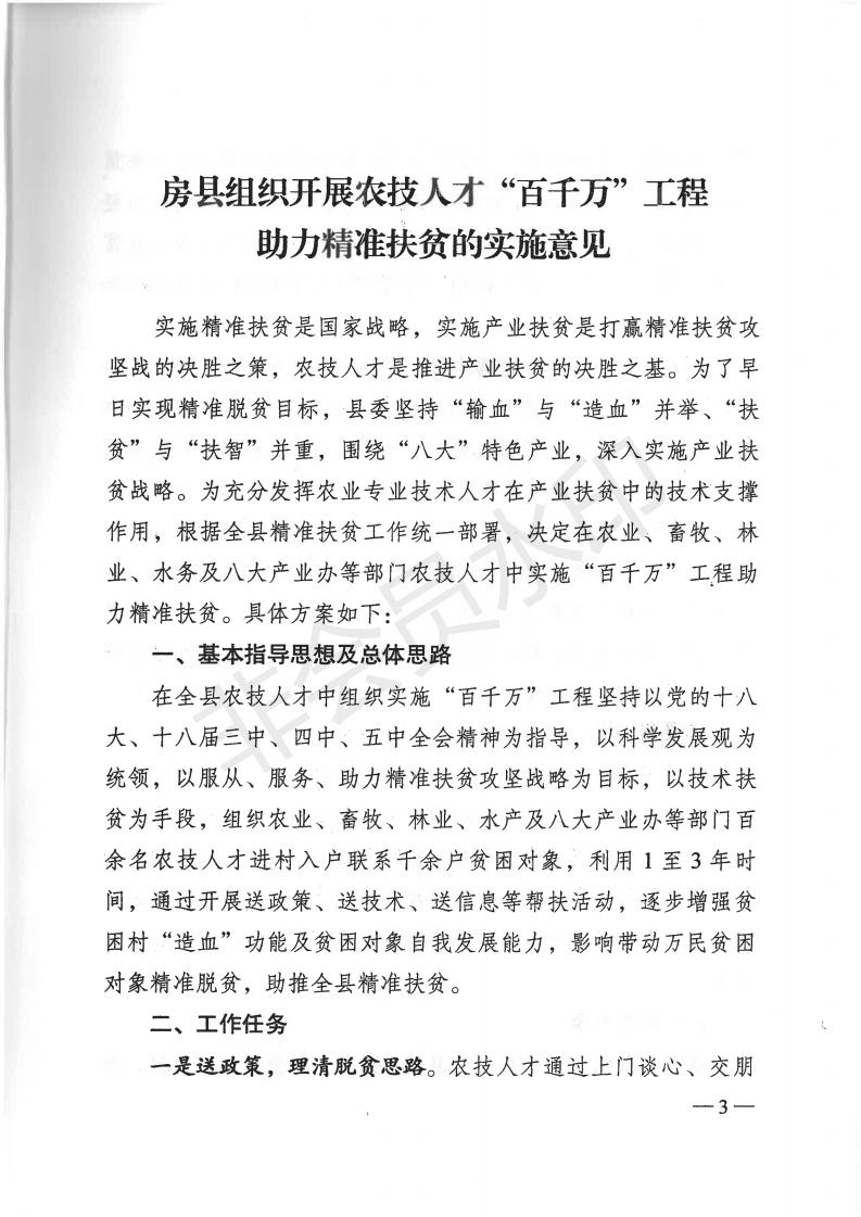 关于印发《房县组织开展农技人才“百千万”工程助力精准扶贫的实施意见》的通知