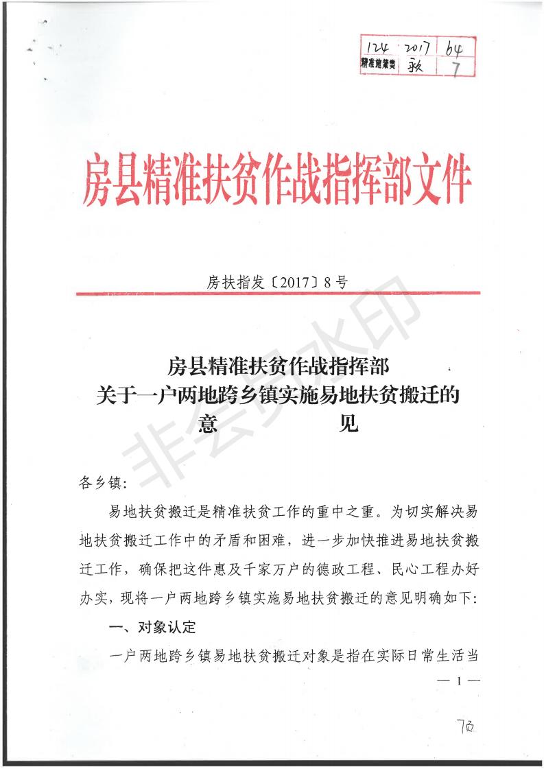房县精准扶贫作战指挥部关于一户两地跨乡镇实施易地扶贫搬迁的意见