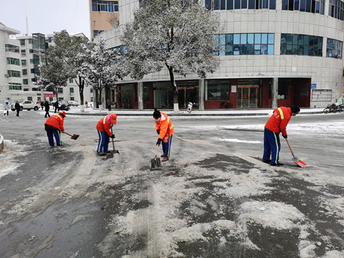 清晨,我县全体环卫工人和城管执法人员依旧奋战在一线,对各个主次干道进行抛撒融雪剂,同时利用人工+机械的作业模式,出动铲车、洗扫车、垃圾车清除积雪,尽快恢复城区卫生环境,力争24小时内完成积雪清扫任务,做到道路不因下雪结冰而影响人员及车辆安全通行。