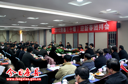 团拜会由县委书记沈明云主持,朱光洪、张慧彬、王启云、陆毅、王家波、刘庆涛、徐锦凤、陈渊、张永平、姚天国、林华、姚峰等县四家班子领导参加团拜会。县委副书记张慧彬向与会的各位领导介绍了过去一年房县经济社会发展情况。