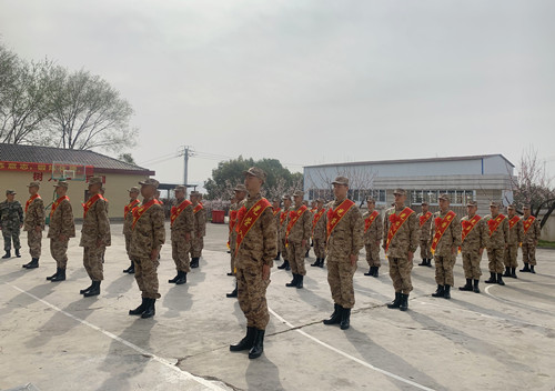 欢送现场,40名新兵胸戴红花,整齐列队,握拳宣誓,表明自己坚定的理想信念和矢志报国的决心。