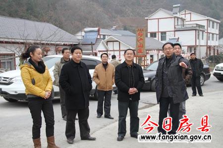 县长朱光洪(左一)陪同成佳刚(左二)查看野人谷镇农村环境整治情况