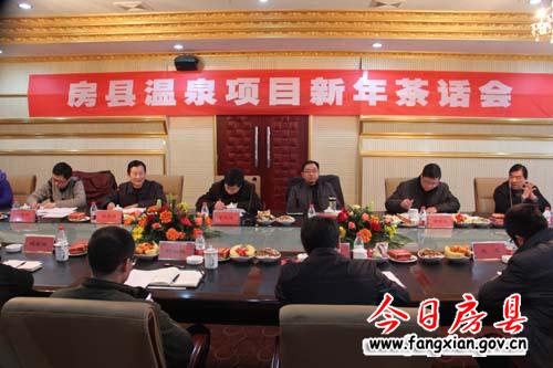 今日房县网讯 记者闻燃报道: 13日,房县温泉项目新年茶话会在中盛洲际大酒店会议室召开。县长朱光洪,县委常委、副县长姚天国,鄂西生态文化旅游圈纪委书记瞿定远,鄂西北事业部副部长谢承魁,房县温泉投资公司总经理郑昊炜出席会议。姚天国主持会议。