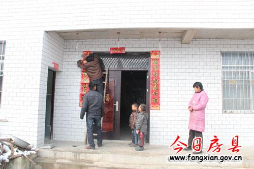 图为人们贴春联的喜庆景象