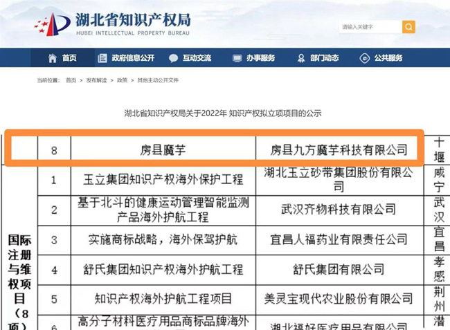 今日房县网讯 通讯员 金勇 报道:近日,湖北省知识产权局发布通知,房县湖北武当动物药业有限责任公司申报的“防治仔猪白痢的生物兽药”和房县九方魔芋科技有限公司申报的“房县魔芋”分别获准2022湖北省知识产权运用示范工程和2022湖北省荆楚品牌培育工程项目立项。