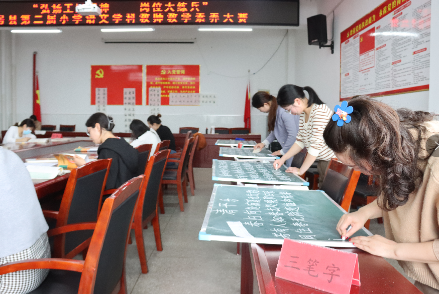 比赛中,共有来自全县五个学区的25名小学语文教师同台竞技,围绕讲课、教材解读、命题、“三笔字”和演讲等五个比赛项目展开激烈角逐。每项比赛时间紧凑,程序严谨规范,10名评委由县直学校、各乡镇分管教学副校长和学科骨干教师组成,根据评分标准现场严格公正打分。参赛选手个个都抱着认真严肃的参赛态度,以最好的精神风貌来对待此次比赛,沉着从容的竞赛风采,展现出扎实的基本功和过硬的综合素养。