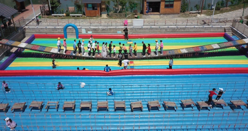 在军店镇白鹤湾田园综合体,除了正在施工的区域,游乐区正常对外开放,网红桥是最受欢迎的娱乐项目,游客纷纷挑战体验。