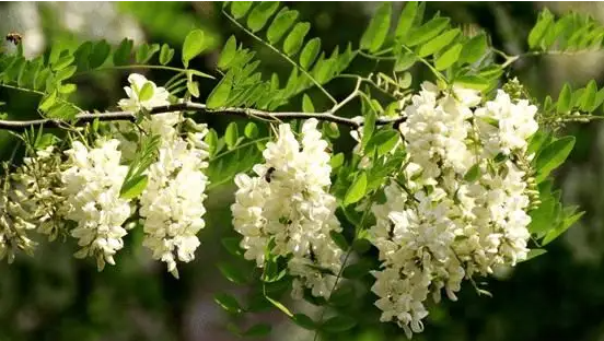 尽管有许许多多的花都在五月之前开了,但还有一些花是在五月里开放的,比如枣花和槐花。枣树和槐树都是先长叶后开花的,枣花是开在叶间的一朵朵的小黄花,好像服装上镶嵌的点点小亮片,在阳光下闪烁着发出神秘的金光;而槐花则是一串串的白花,如同高级时装上牵缀的蕾丝花边,在春风中颤动着展示高雅诱人的华丽。这两种花最是招引蜜蜂,而枣花蜜和槐花蜜都是蜜中的上品,也是人们最喜爱吃的。