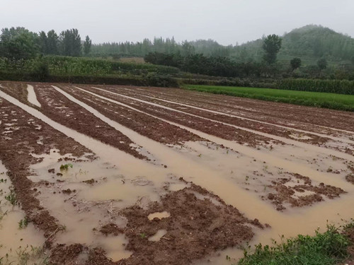 据了解,目前积水的这片田地种着20余亩的蔬菜,村民徐前担心强降雨影响蔬菜幼苗的出苗率,一大早便来到田间进行巡查。