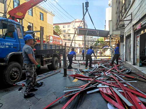 经过一周的摸排,整治专班将发现的700余处隐患点建立台账,按照危险等级进行分类处置,对存在破损、倾斜、脱落、松动、不符合设置规范等安全隐患的,向产权人下发限期整改通知书,要求其在规定时限内及时采取修复、加固等措施,并进行复查。对存在安全隐患的楼顶广告招牌、达到设计使用年限的大型高立柱广告、未按审批备案要求设置的户外广告设施招牌、无主户外广告设施招牌、垂直于建(构)筑物墙面设置的户外广告设施招牌,以及未经批准擅自设置的户外广告设施招牌,纳入整治清单,统一组织由专业施工人员拆除。