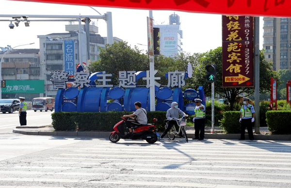 在诗经广场路段,随处可见民警和交通志愿者面带微笑,引导行人和机动车遵守交通规则。