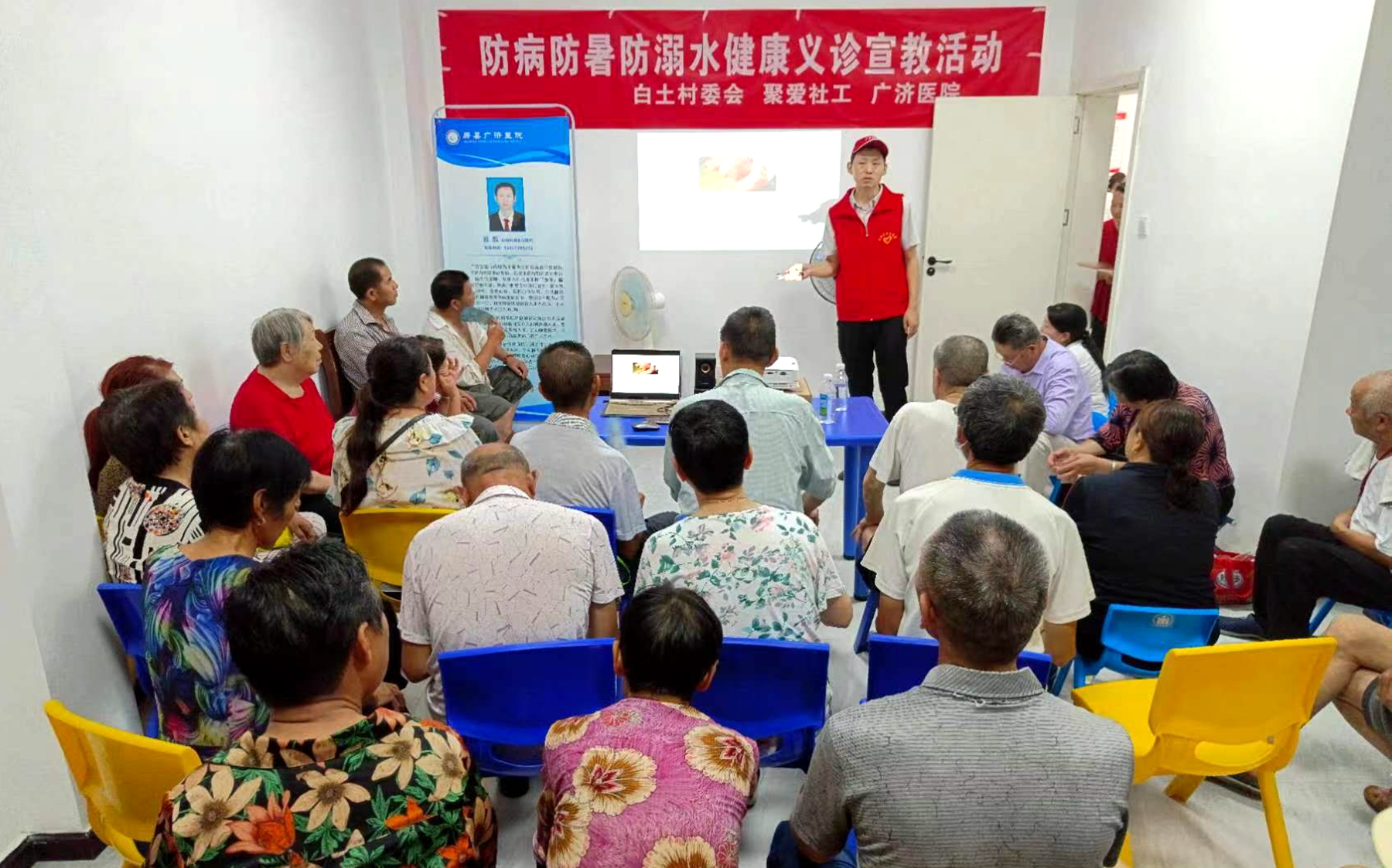 本次活动由房县广济医院、城关镇白土村、聚爱社工志愿者服务队联合进行。参加宣讲的县广济医院医生结合社区内实际情况,针对老年人及孩子等弱势群体,用更多人民群众喜闻乐见的方式,从夏季高发的肠道传染病、虫媒传染病、高温中暑的防范开始讲起,再到预防儿童青少年溺水、高空坠落、动物咬伤等意外伤害事件的发生,引导群众认识了解预防肠道传染病,把住“病从口入”至关重要;预防高温中暑,补水防晒要及时;防范孩子溺水,重点是要防思想松懈、防野泳行为、防重点水域。