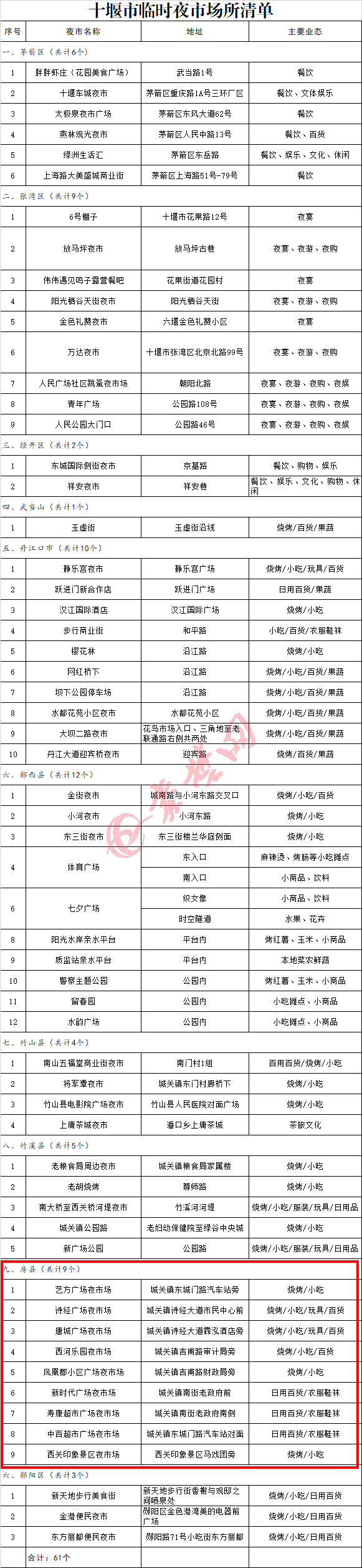 目前,十堰共设61个便民夜市,提供商铺(摊位)6450个,主要业态为特色烧烤、小吃、饮品、潮玩等,带动直接就业2万余人。