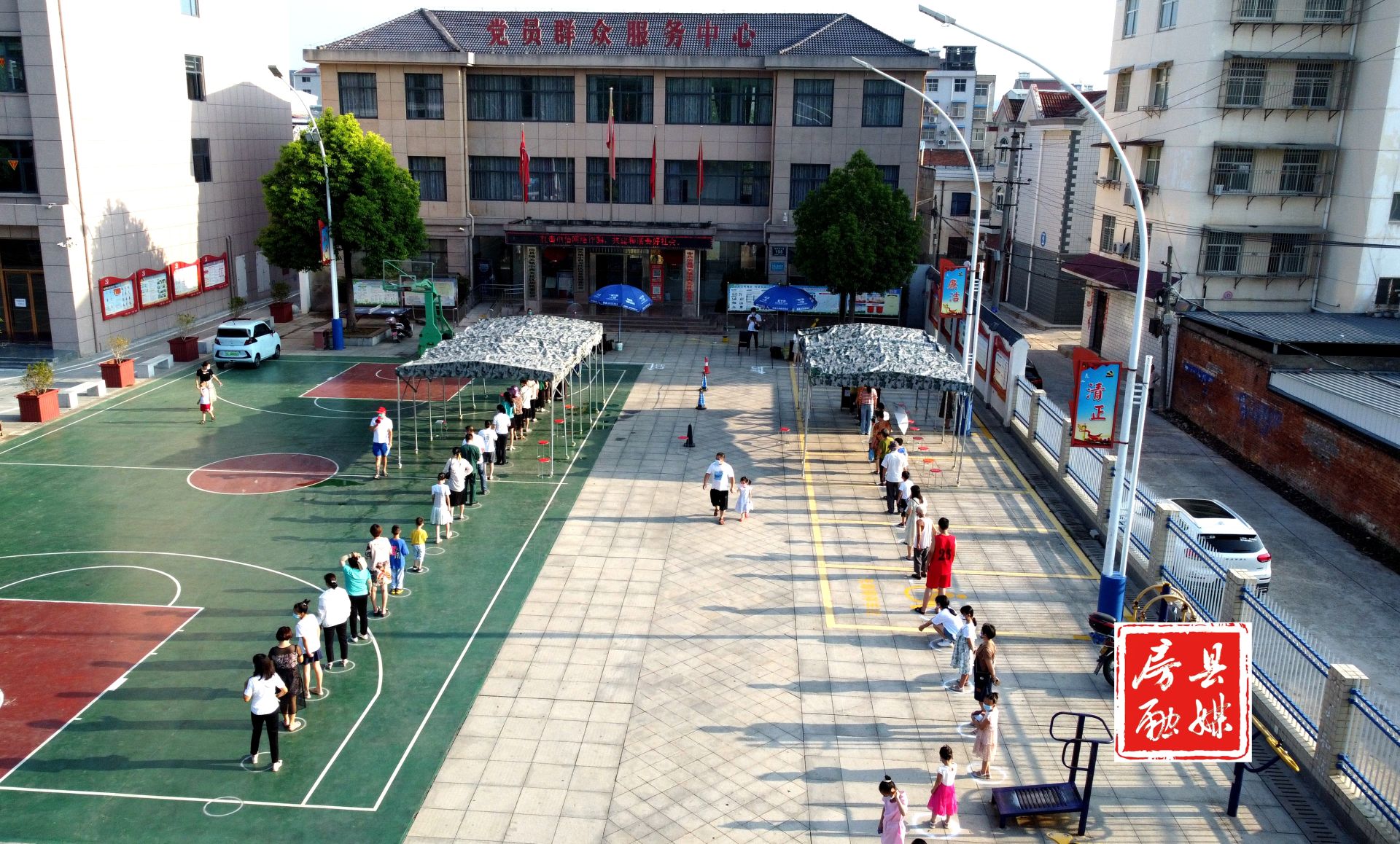 太阳越来越大,两台电风扇,两把遮阳伞,再把社区的宣传牌挪过来,为医护人员和采样人员遮挡一下阳光。朱丽说:“一方面要严格按要求维护好现场秩序,另外一方面尽全力为群众提供力所能及的服务,为医护人员尽量创造一个凉快的工作环境。”