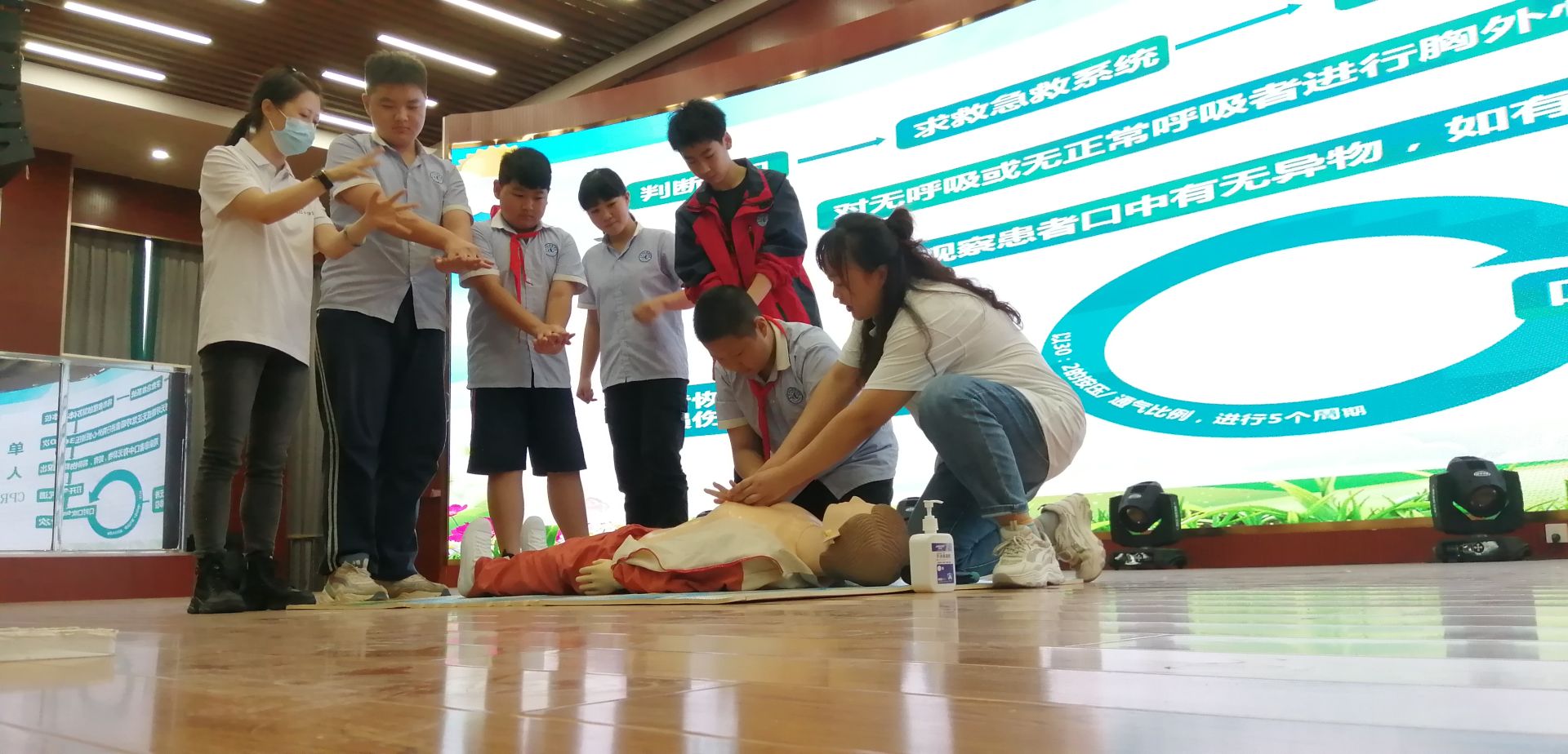 台上,红十字应急救护师阮萍用生动活泼的案例向老师和学生们普及了应急救护知识,重点告诉大家如何正确拨打120急救电话,突发情况下实施海姆立克急救法和心肺复苏的操作方法。台下的学生们听得聚精会神,学习热情高涨。一到实操环节,更是全场“沸腾”,踊跃上前,小手举得高高的。