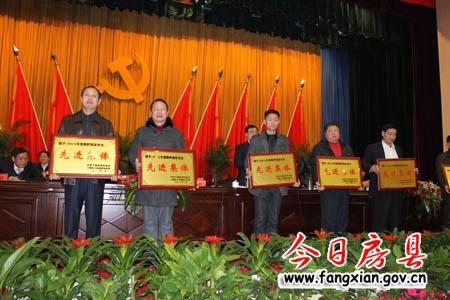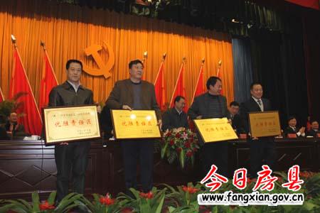 今日房县网讯 通讯员朱晓东 方文 报道:2月28日,全市政法工作会议在市行政会议中心召开。房县被市委、 市政府授予全市“社会治安综合治理优胜责任区”和“维护国家安全工作先进集体”,市委书记陈天会为房县颁奖,县委常委、政法委书记杜启学上台领奖。