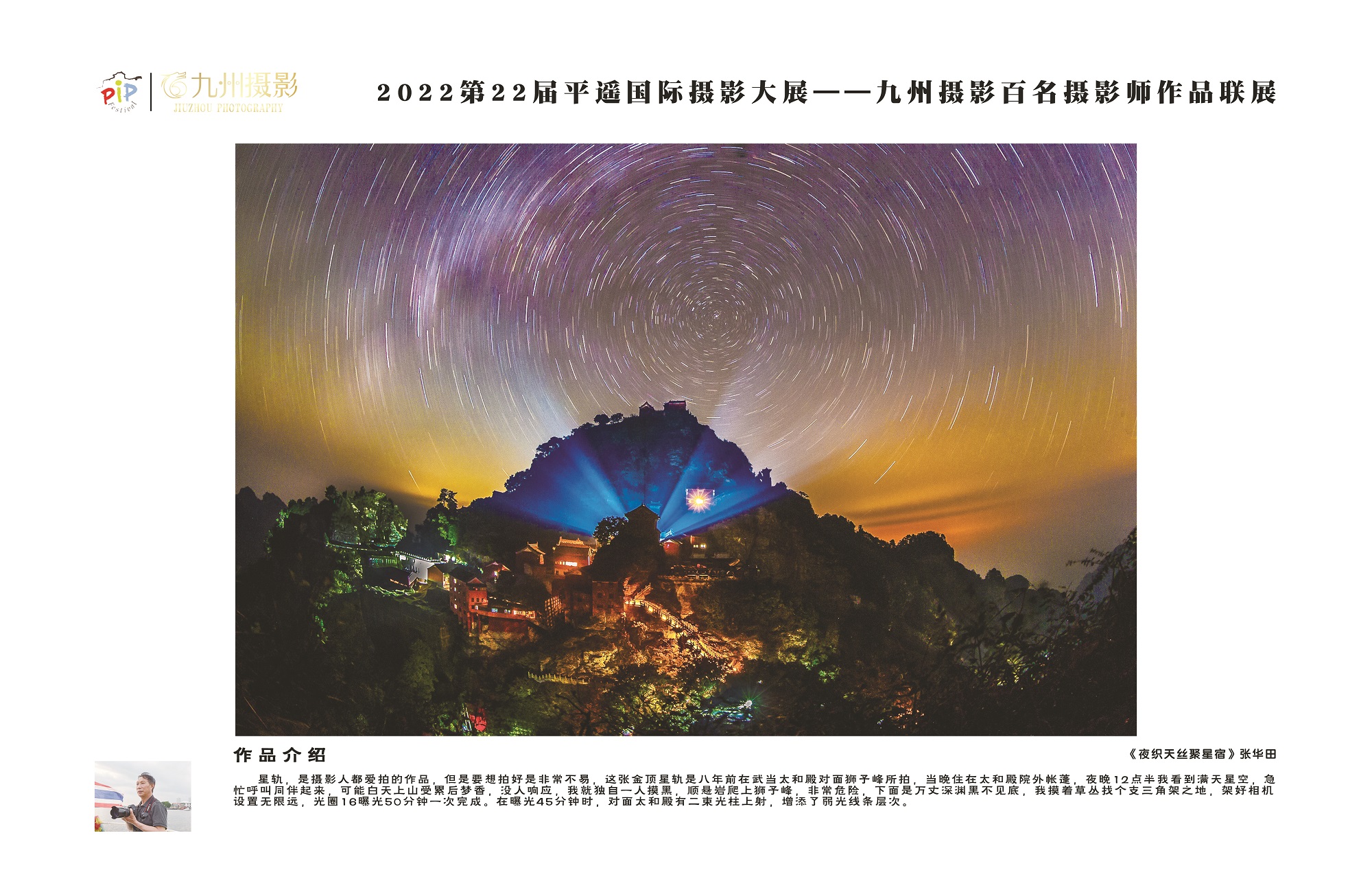 今日房县网讯 通讯员 张立林 报道:9月19日,九州摄影百名摄影师联展——2022第22届平遥国际摄影大展盛大开幕,房县摄协顾问、中国摄协会员张华田的摄影作品《夜织天丝聚星宿》获“艺术观念类”作品组一等奖,并由九州摄影研究院收藏。