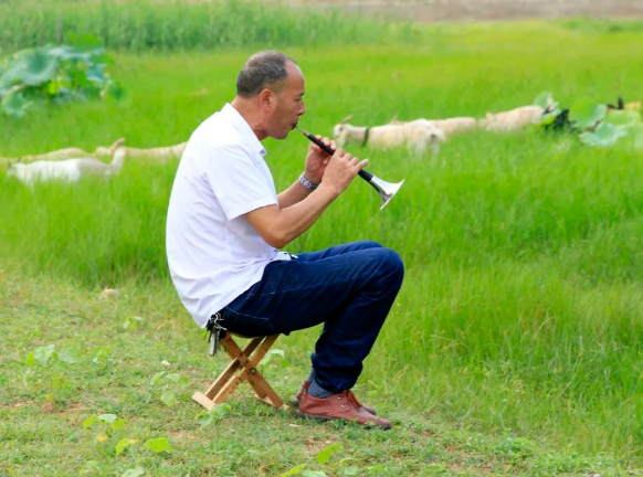 当天,房县军店镇上茅坪移民新村村民结伴在水库湿地吹奏哨呐,阵阵浑圆的哨呐声飘进村庄。