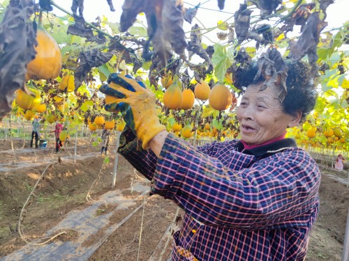 今日房县网讯 记者 李硕 何赛男 报道:眼下,房县军店镇中村村的吊瓜种植基地迎来了丰收。一个个金灿灿的吊瓜,一张张喜悦的笑脸,构成了一幅亮丽的丰收画卷。