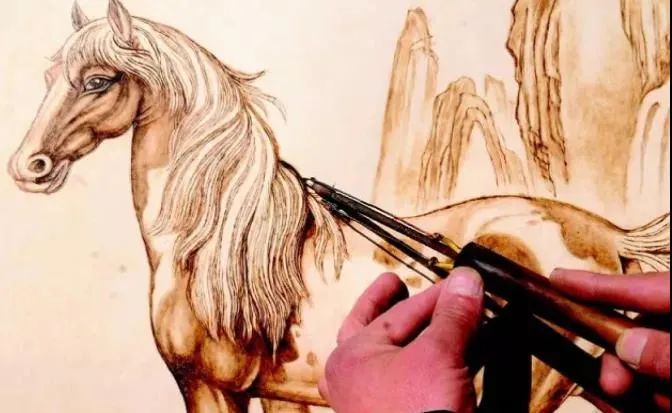 房县烙画始于清光绪年间,是用烧红的烙铁等特制工具模仿绘画的方式将画好的图案烙在竹木等材料上,烙画工艺的技巧完全掌握在作画人手中。作画人利用碳化原理把中国画“墨”的层次表现出来,一般用烙铁的温度和手的力度来表现层次感,用烙铁的棱角来勾勒线条,最后用彩铅来渲染颜色。