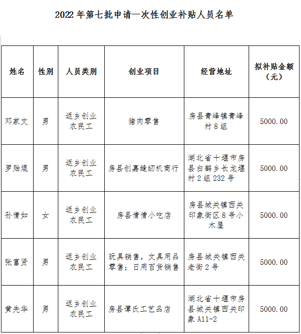 为推动创业带动就业工作,加强对返乡创业人员的创业扶持,根据《中共湖北省委 湖北省人民政府关于印发<湖北省建立健全城乡融合发展体制机制和政策体系的若干措施>的通知》(鄂发﹝2021﹞3号)等政策文件的规定,现将已受理的返乡创业人员一次性创业补贴申请情况予以公示。公示时间为5天(2022年12月12日至12月16日),在此期间,欢迎社会各界人士以来电、来信、来访的形式对以下申请对象进行监督、反映情况。