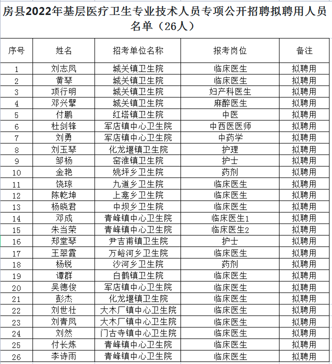 2、房县2022年基层医疗卫生专业技术人员专项公开招聘拟聘用人员名单(26人)