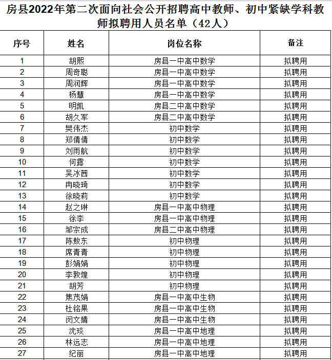 附件:1、房县2022年第二次面向社会公开招聘高中教师、初中紧缺学科教师拟聘用人员名单(42人)