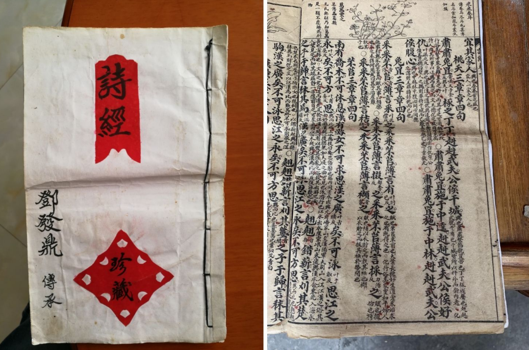 《诗经》是我国第一部诗歌总集,堪称中华文化的元典,2000多年来,一直是中国人修身齐家治国平天下的教科书。邓发鼎家的这本《诗经》是清朝年间出版的,上面印有《诗经》的原文和注释,传下来已经200多年了。看着被损毁的古书,邓发鼎很是心疼,他自己做了个封皮,又用针线一针一针地把它装钉好,还用毛笔在封皮上端端正正地写上了书名和自己的名字。后来,邓发鼎对这本残书珍爱有加,时刻都将它带在身边,有空的时候就拿出来翻一翻、看一看。
