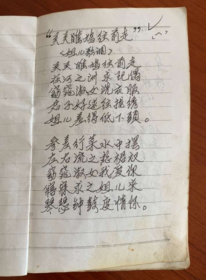 傅广典:我们去了就给我们唱,唱了很多很多的歌,里头呢就发现有《诗经》这个句子。它这个句子呢它有两种方式,一个就是那个后缀式,他把《诗经》(句子)唱到前面,在后面呢再搁他的一个创作的句子。你比如说“关关雎鸠好姻缘,在河之洲美少年,窈窕淑女一朵花,君子好逑跟姐走。”还有呢就把它夹在中间,把完整的诗句夹在中间。你比如说“你也有来我也有,云兄听我唱一首,关关雎鸠,在河之洲”就这样唱起来了。