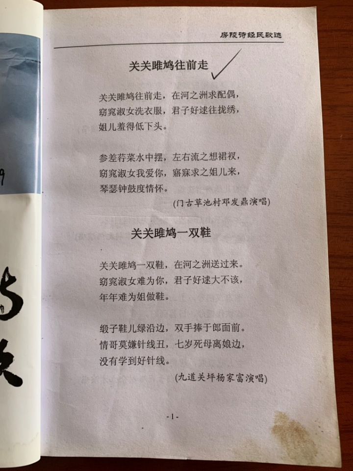 起初,邓发鼎并不知道他唱的歌词“关关雎鸠,在河之洲,窈窕淑女,君子好逑”出自《诗经·关雎》,他只是有一种纯朴的直觉,觉得这些民歌的歌词很好,既有文采,又有乡土风情,用民歌的腔调唱出来,格外好听。他深深地爱上了唱这些民歌。