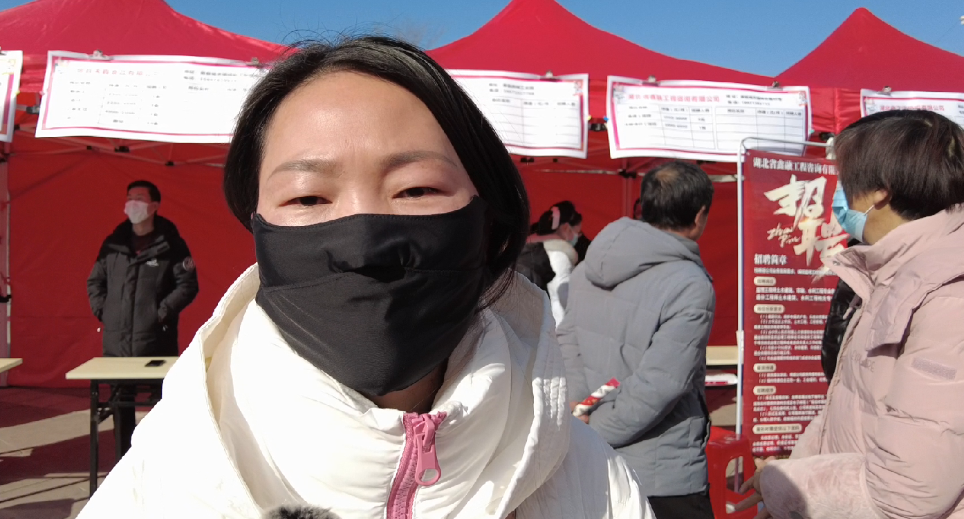 求职者 李新:我是通过朋友介绍(的方式),今天来到这个招聘会,想找一份周末能休息的、平时能兼顾小孩的工作。