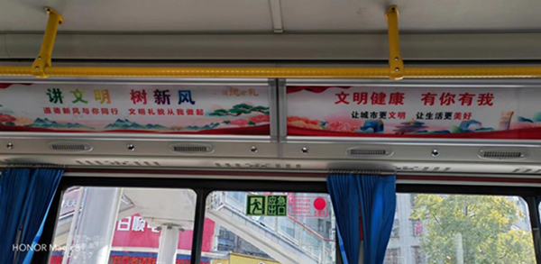 公交车厢内“社会主义核心价值观”“创建文明城市 实现安居乐业”“讲文明树新风”“文明出行”“关爱保护未成年人”等创文公益广告,不仅装点着城市文明,也散发出道德芳香。在向市民传递向上、向善正能量的同时,也于无声无息间,把文明新风融入市民日常生活,让道德理念走进百姓心灵。