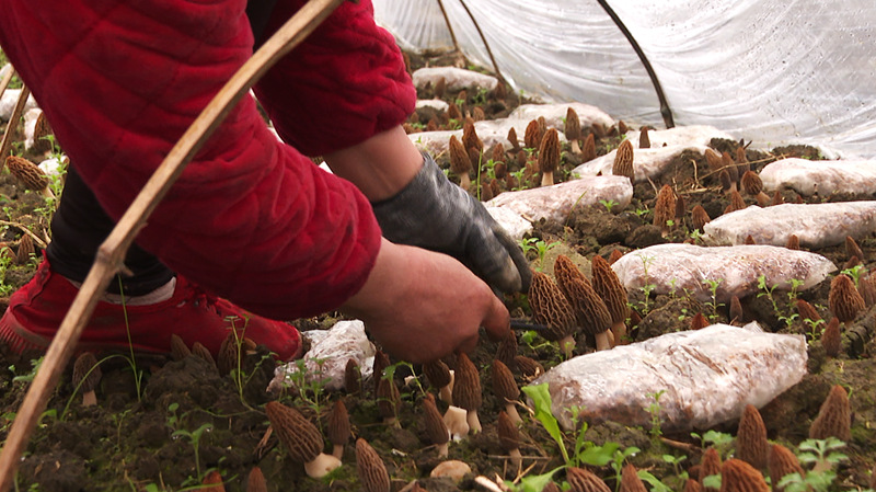 春天不仅是播种的季节,也是收获的季节,棚外春寒料峭,棚内却暖意融融。75亩羊肚菌经过一个冬季的孕育,如雨后春笋般破土而出,一朵朵羊肚菌撑着褐色的“小伞”,错落有致地盛开在菌垄上,菌香扑面而来。采收的村民们拿着小刀穿梭在菌垄间,小心翼翼地将鲜嫩肥厚的羊肚菌采下装入筐中。正在采摘羊肚菌的村民王桂珍告诉记者,去年冬天都在这务工,全年基本上都在这做,一天工钱七八十块钱,这个羊肚菌基地离家近、有钱挣,满意得很。