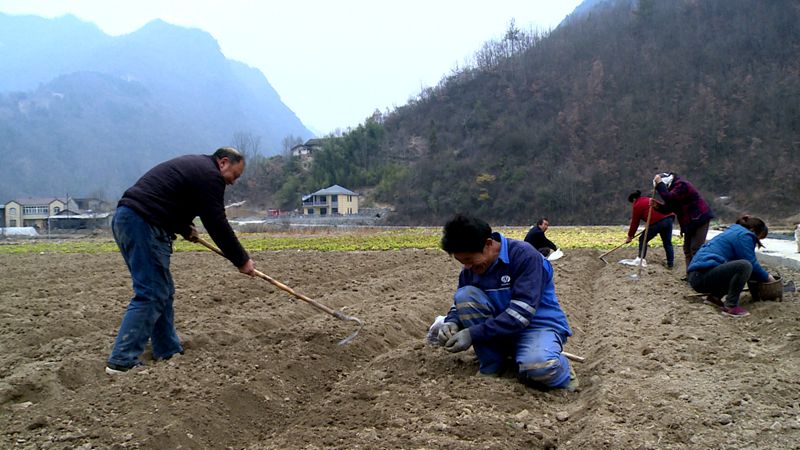 在八里坡村的药材种植基地,村民们正在田间地头开沟、下种、覆土……有条不紊地栽种苍术 。