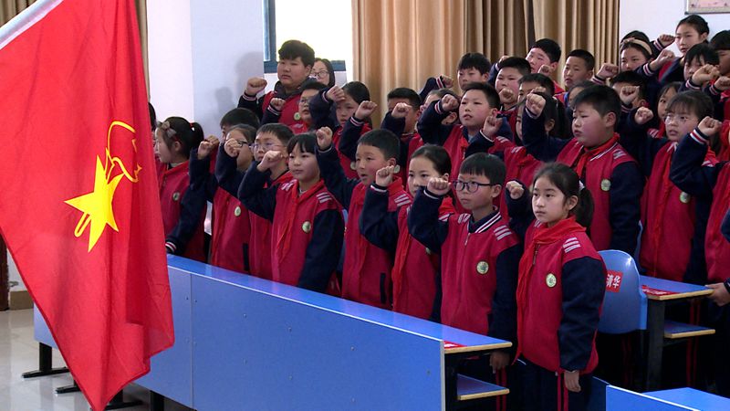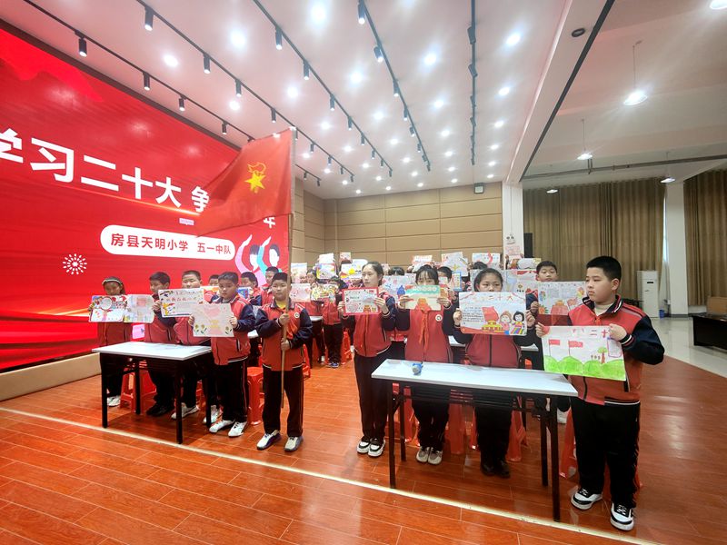 在天明小学队会课上,老师正播放《非凡十年》微视频等视频,带领学生深刻感受中国正发生的翻天覆地的变化,为学生讲解中国十年来具有重要意义的三件大事。课堂最后,学生高举自己绘制的以党的二十大精神为主题的手抄报,表达新时代少年的美好愿景,努力成为共产主义事业的建设者和接班人。