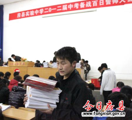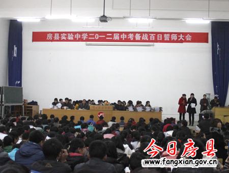 今日房县网讯 见习记者刘臣 通讯员付传斌 报道:20日,县实验中学2012中考备战百日誓师大会在该校大礼堂召开,该校596名初三学生向中考发起百日冲刺行动。