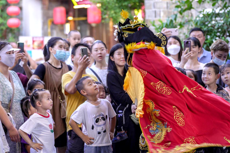 身穿各种不同古风服饰的游客朋友们穿梭在西关印象里,随时随地可以欣赏到舞蹈快闪、小丑表演等节目中,与工作人员友好互动,拉满游玩体验感!