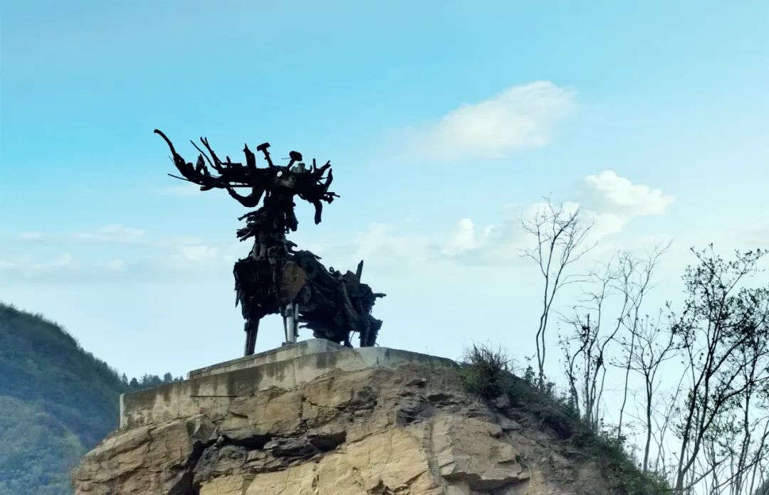 为了迎接我们的到来,年轻有为的晓虎书记和美丽能干的李轶乡长亲自当起了导游。他们口吐莲花,诉说着你的前尘往事和今生今世,也向我们揭开了你的神秘面纱。我一路都在思索着,你是有多大的魅力和积淀呢,竟吸引了四面八方的目光前来一睹你的芳颜?是无私奉献的库区精神,还是艰苦奋斗的移民精神,抑或助人为乐、一诺千金的优秀品质?在“共同缔造”示范村——化口村,我找到了答案。这是一个像葫芦状的村落。村口紧接化口大桥,又处在太和梅花谷景区入口,占尽了地理优势。进村口不远有一处小型广场,名曰:鹿鸣广场,最先映入眼帘的是右侧山包上的一只鹿。李乡长介绍说,鹿是用废弃挖机的零部件组装而成,既变废为宝,又和西关印象的鹿鸣广场遥相呼应。这只鹿栩栩如生,气运流转。它矗立在高处,既遥望远方,又躬耕脚下,像极了奋斗不息的姚坪人民。