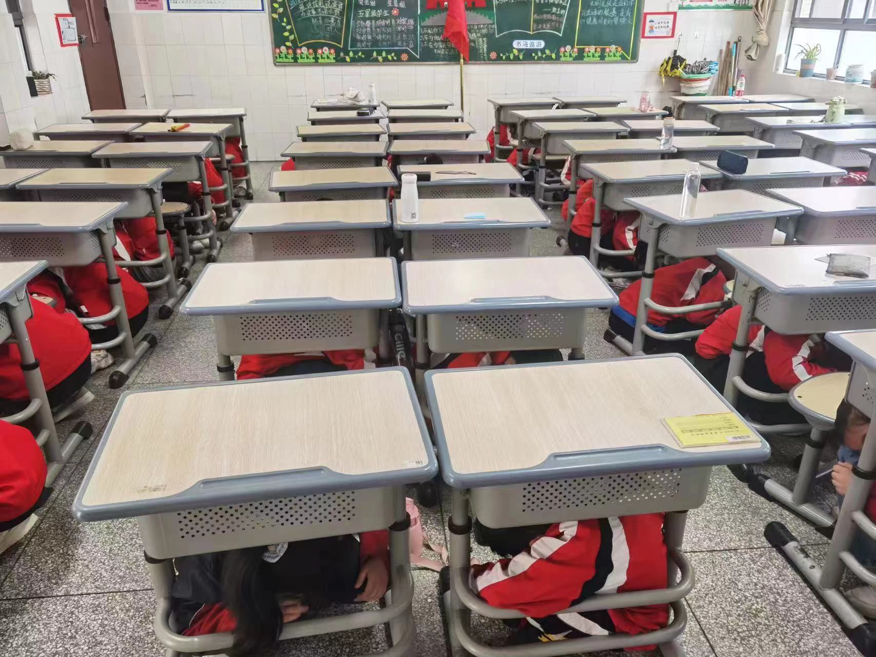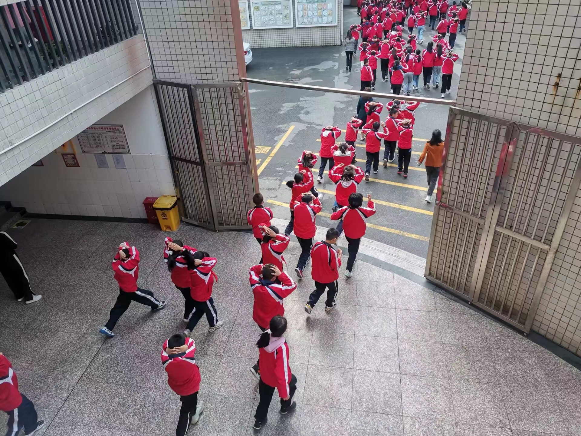 实践减灾行动,坚持演练先行。为使本次防震减灾演练活动做实、做细,各班班主任于演练前在班内开展防震减灾知识专题讲座,结合视频、图片、动作示范,使学生知晓应急避震和安全疏散的正确方法。随着第一声警报响起,各班主任立即指导学生双手护头、蜷缩身体躲在课桌下。第二次警报响起,各班迅速按照指定路线,从各楼层安全通道紧急撤离教室,到达操场并由班主任清点人数,确保学生无任何伤情。整个过程严谨有序,演练用时2分40秒。