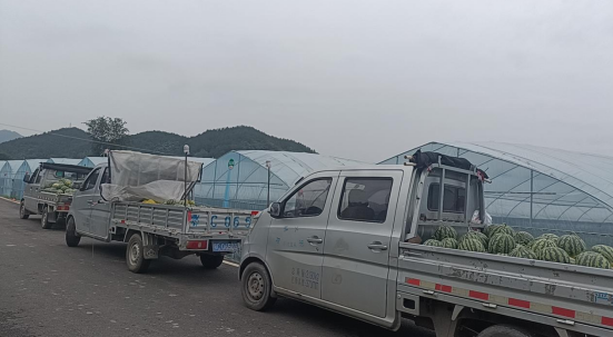 采摘好的西瓜整齐码放在车上,一车车西瓜直接从大棚基地开往各农贸市场收购点。