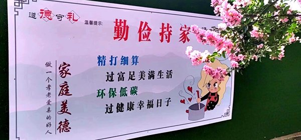 西关印象北面,其二期工程的建设如火如荼。草绿色背景墙的施工围挡将建筑工地与绿化带隔离开来。绿化带内,树木成荫,繁花似锦。围挡外立面间隔着张贴了一幅幅图文并茂的创文公益广告。一花一木皆是景,一言一行要文明。这些设计巧妙、主题鲜明、寓意深刻的公益广告,以大众喜闻乐见的方式,将传统文化与现代文明完美融合,潜移默化影响着人们的言行举止,与绿树繁花相辉映,共同“点”亮城市文明,营造浓厚的创文氛围,让街道“颜值”变靓、“品质”提升。