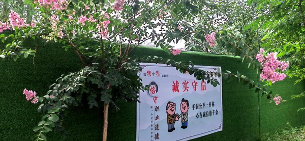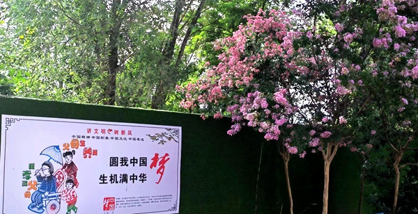 片片绿叶、簇簇繁花在点缀街道、妆点城市的同时,也扮靓着围挡上的公益广告。这些集教育、宣传、美化于一体创文公益广告如同一张张灵动的城市文明标签,与紫薇花在盛夏相遇,是美丽景色与现代文明的融合,绘就了一幅和谐自然的生态画卷,为南宁路吹来一缕缕文明新风。