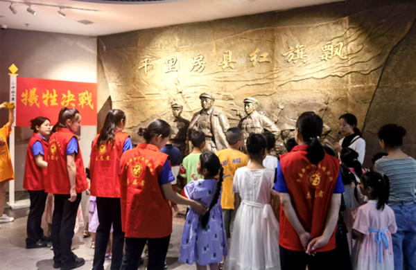 在“千里房县红旗飘”红色文化展览区,志愿者和孩子们认真聆听解说员讲述那段艰苦卓绝的岁月,仔细瞻仰了展厅内的图片和实物。一件件珍贵文物、一张张珍贵照片、一段段感人故事和一个个复原场景,重现了老一辈无产阶级革命家在极端艰苦的条件下,紧紧团结和依靠广大人民群众,创建人民军队、开辟革命根据地、建立红色政权的峥嵘岁月。讲解员带领大家回顾了土地革命时期、抗日战争时期和解放战争时期革命先烈们不怕牺牲、英勇奋战的先进事迹,了解了贺龙率红三军在房县英勇斗争的革命历程,学习了房县革命烈士李明铨、雷天明、乔三元和叶八奶奶等感人事迹,深刻感悟了房县共产党人和革命群众不怕流血、无所畏惧的精神。