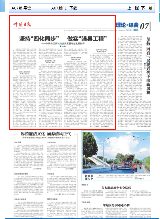 编者按:8月3日,十堰日报理论综合版刊发房县县委书记纪道清撰写的《坚持“四化同步” 做实“强县工程”——加快山区县域经济高质量跨越发展初探》文章。文章中说,房县深入学习贯彻党的二十大和省第十二次党代会精神,高举省委市委授予的“绿色低碳循环发展示范县”发展大旗,以流域综合治理统筹山区县工业化、信息化、城镇化、农业现代化同步发展,跑出了“强县工程”加速度。