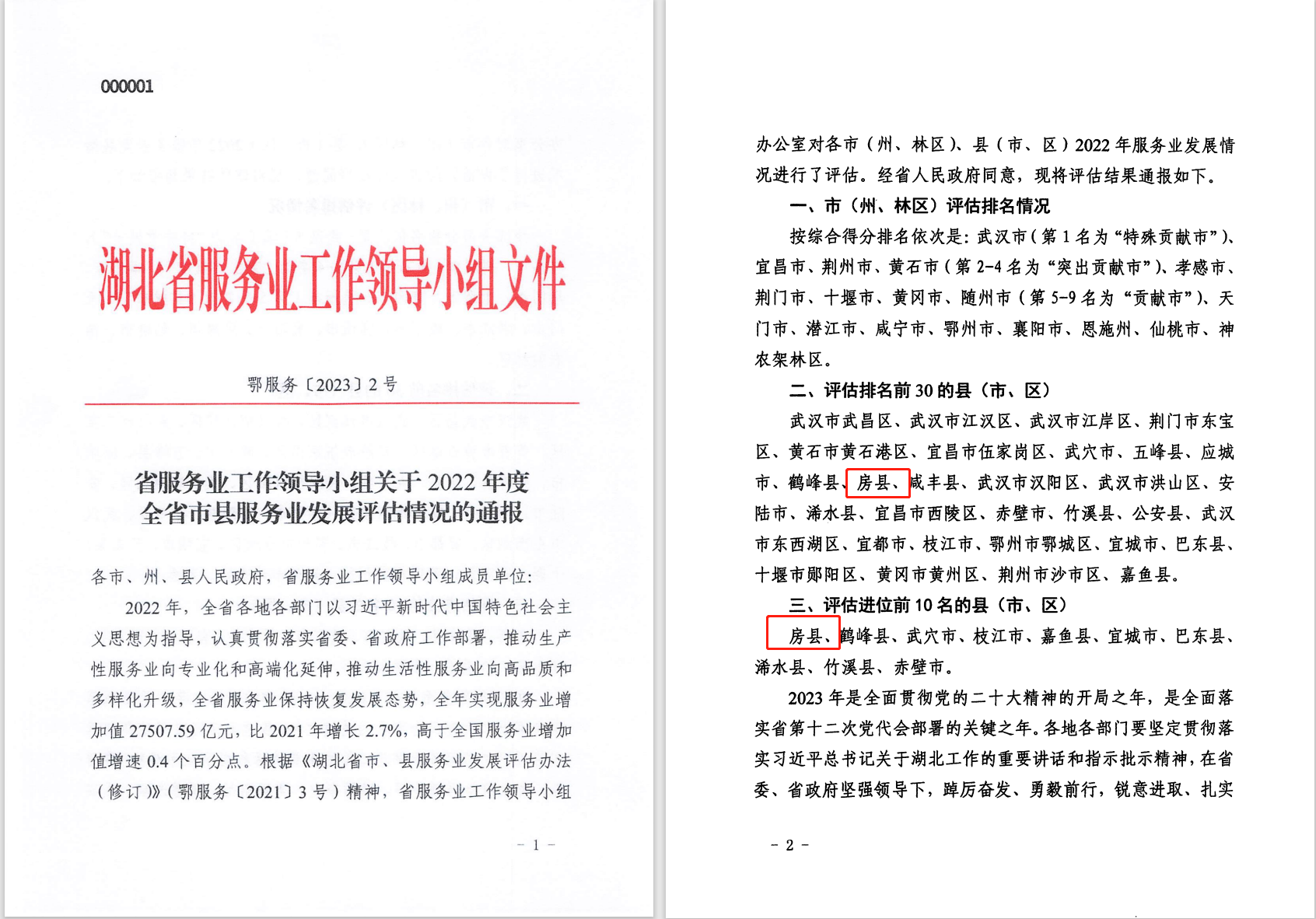 房县新闻网讯 通讯员 施真 刘鹏 报道:近日,省服务业工作领导小组印发《省服务业工作领导小组关于2022年度全省市县服务业发展评估情况的通报》,房县在全省98个县(市、区)中排名第11,评估进位排名第1。