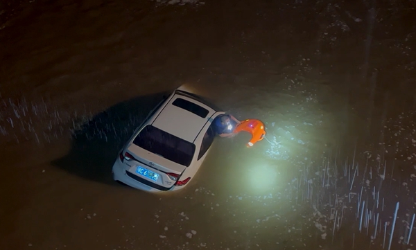 消防救援人员到场后,经现场侦查,一辆白色小轿车被困河道中央,河水已没过车身一半儿,车内一名驾驶员正拿着手机灯发出求救信号。当晚正下着大雨,河水不断上涨,现场指挥员立即指挥消防救援人员检查好个人防护装备,携带救援装备进行救援。消防救援人员找到离车主最近的位置,利用水上救援飞翼接近被困人员,并指导被困人员抓住机身两侧的手带后,进行牵引作业,经过约5分钟紧急救援,被困人员被成功救出。