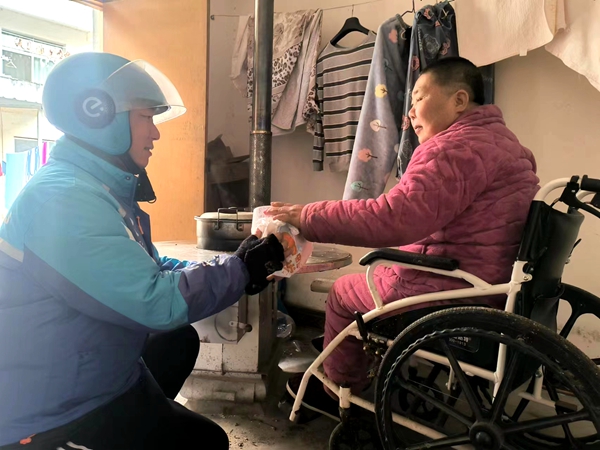 还有一次,送外卖到一家医院,发现有一位病人躺在病床上行动不便,需要帮助,他就主动帮助病人拿药,给他倒水、喂药,让病人感到非常温暖和舒适。
