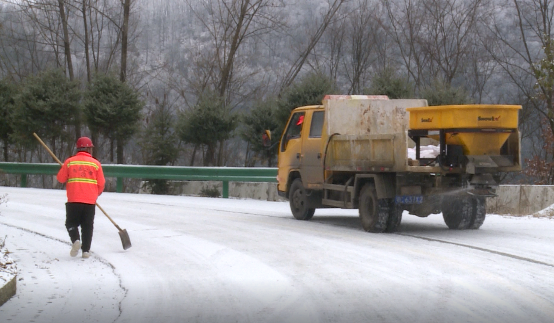 野人谷镇十回首路段,是房县弯道最多、坡度最大的、冬季最易结冰的路段,在现场,工作人员正在通过机械和人工相结合的方式,最大限度的清除路面上的冰雪,确保来往车辆缓慢安全通行。