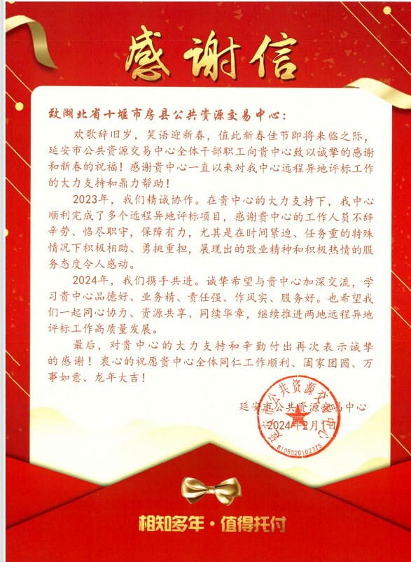 今日房县网讯 通讯员 刘红 报道:2月5日,房县公共资源交易中心收到来自陕西省延安市、湖北省广水市、十堰市竹溪县的感谢函,对我中心在跨区域远程异地评标工作中给予的配合和支持表示由衷的感谢。