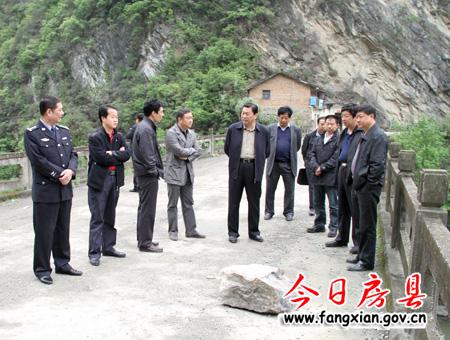 图为县委书记沈明云一行实地察看九道乡义渡坪大桥转址工作